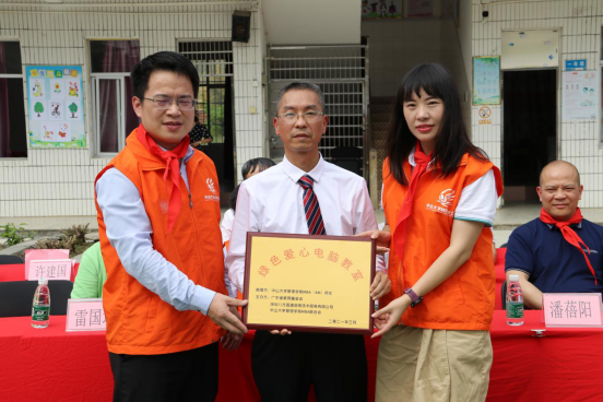 中山大學管理學院MBA聯合會陳可文、王立秀副主席向馬頭鎮大席小學贈送“綠色愛心電腦教 室”牌匾,許建國校長接收牌匾.